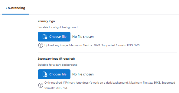 - Click on the Co-Branding tab and choose your Primary logo file for light mode and Secondary logo file for dark mode