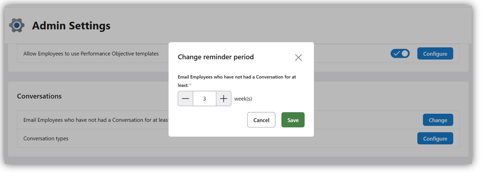 - Select the "Change" button for Email Employees who have not had a Conversation for at least 3 week(s)