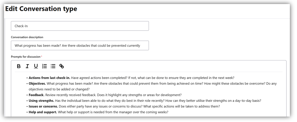 - You can add hyperlinks to the prompts to link to relevant resources, such as company values or competency frameworks.