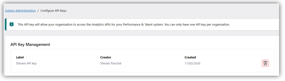 The API key provides direct access to your Performance & Talent data and should be handled carefully. Only one active API key is allowed per organisation, so it's essential to coordinate with colleagues who may need access.