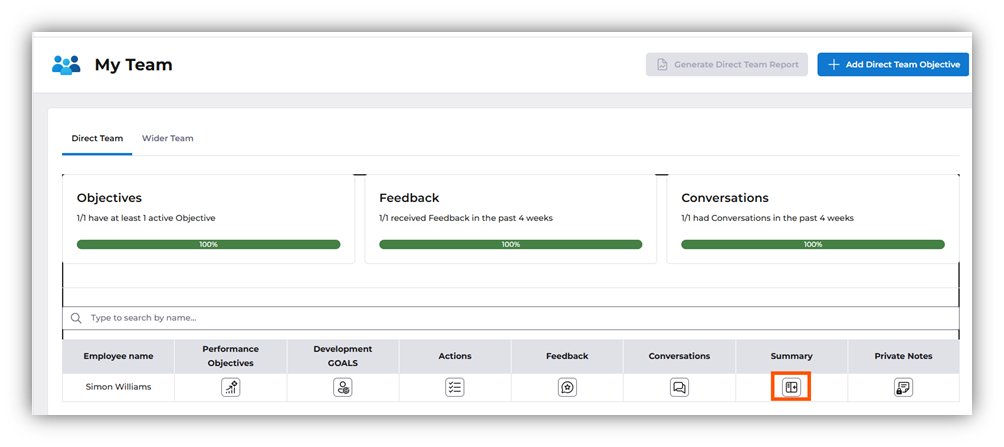 Managers also have the ability to generate a summary of performance for their direct reports.