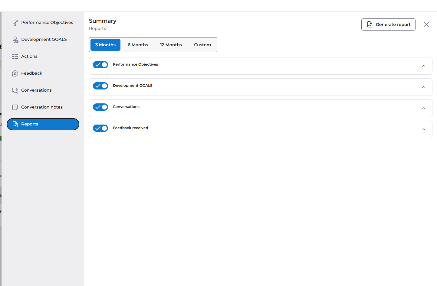 This can be useful to help prepare for an upcoming check-in or conversation. The report will pull together all of the direct report's performance activity for a specified time period relating to Objectives, Conversations (optionally including related comments, notes and actions) and Feedback activity*.