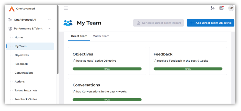 The top-level dashboard will give you quick stats around how many of your direct reports have current objectives or are in need of feedback or a check-in conversation. You can also view a detailed report for all of your direct reports by using the download.