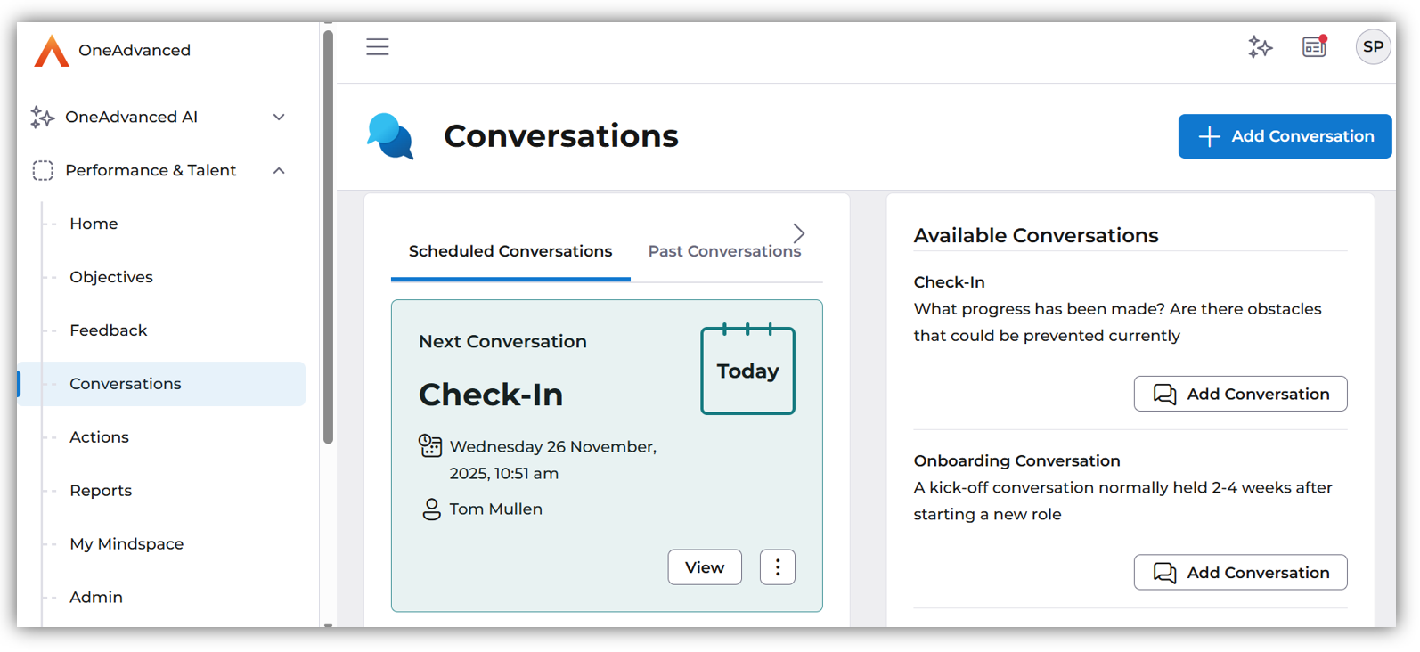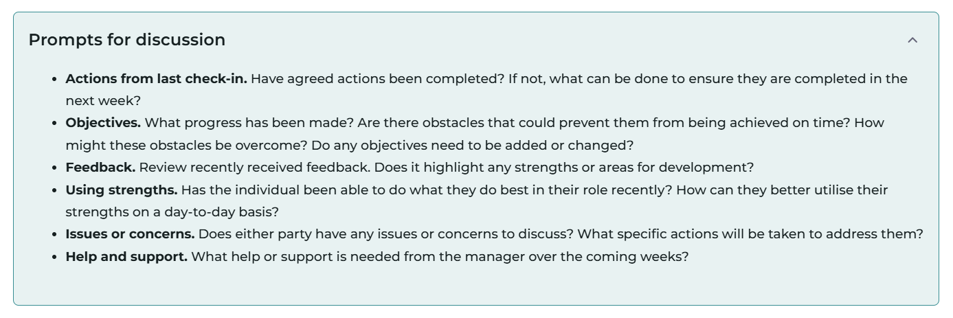 - You will notice a few tips around suggested actions to help you prepare for a performance check-in conversation.