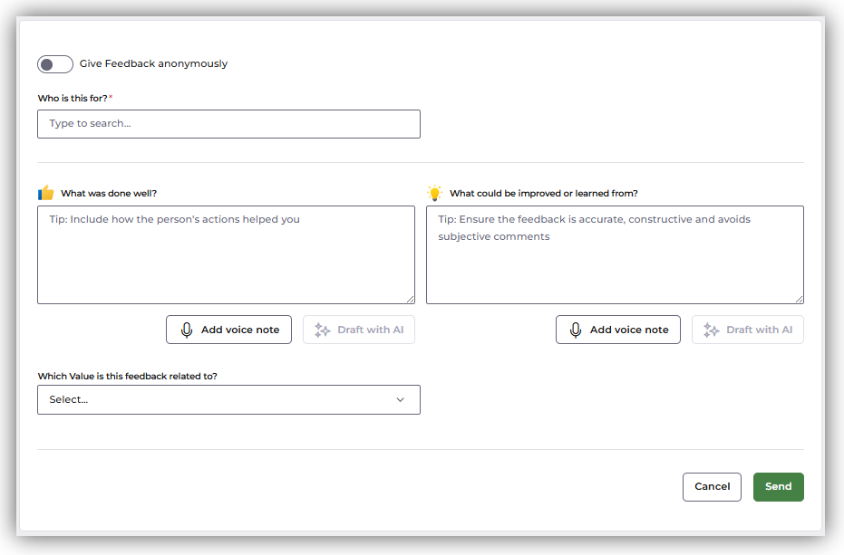 - Select the Give Feedback button from Add drop down. This will open a new Give Feedback page.