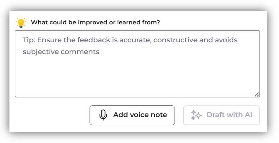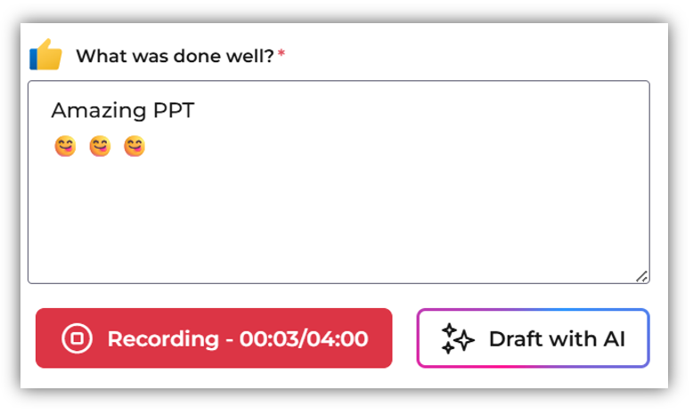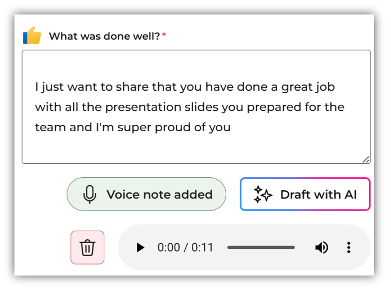 With the introduction of Voice Notes, giving Feedback has never been easier. Simply speak your message, and the system will transcribe it for you—no typing required.