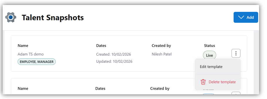 Note: Editing a template is dynamic, so updated templates will only appear for future talent snapshots.